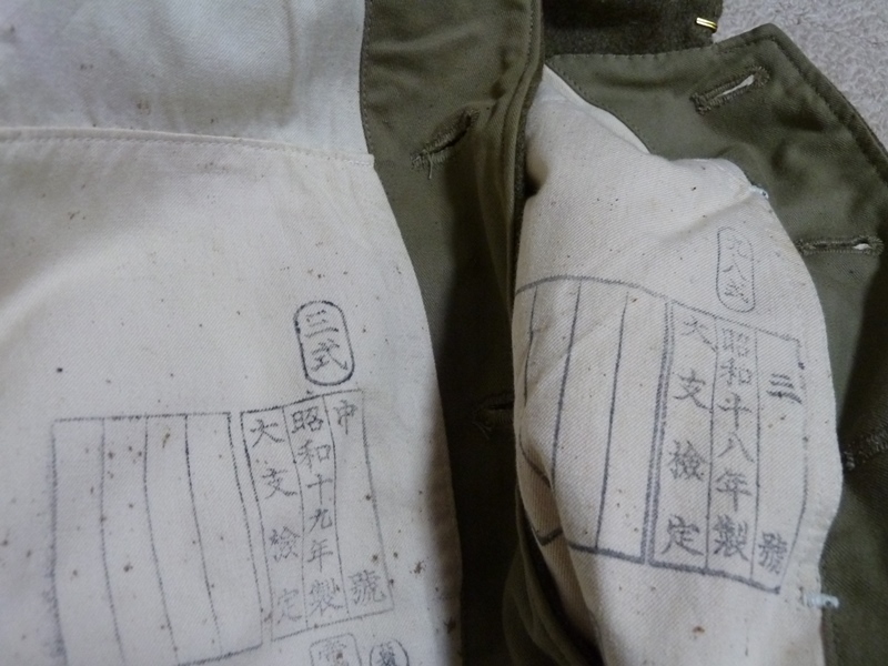 軍服の手入れについて ①夏軍衣、襦袢等の綿生地 雑記 2015年04月24日 70年以上前の服を手入れするに当って気付いた問題点を書いていきます。 といっても、全自動洗濯機が当たり前の世代にとっての問題点であってそれ以前の方には当然の話しかもしれません。 また基本的にこれから書く内容はコレクション等の用途についての話で当時の方法とは関係ありません。 当時のやり方については”被服手入法”に記載があります。 目次 0.劣化の原因、劣化度 1.手入れ法(現代品との相違点) 2.洗濯方法 3.アイロンがけ 0.劣化度や生地について 当然ながら70年前のものですから多かれ少なかれ経年劣化が有るものと見て良いかと思います。 その原因は多々ありますが、ある物質(要素)が生地に対して劣化の影響を及ぼす事が根本的な原因です。 こういう範囲のことを詳しく勉強したわけではないので間違っているかもしれませんが、 劣化の原因は カビ、ホコリ、湿気、汚れ、紫外線、虫害、生地擦れ 等があると思います 劣化度は生地の擦れと日焼けやホコリの溜まり具合、汚れにて判断します (個人的な観点なので色々違う見方もあるでしょうが一応はこの方法でうまくいくと思います。) まず生地の擦れですが、使用していく内に綿がハゲて薄くなって来ますので、擦れを確認して生地の強度低下を確認します。 より布がペラペラになっていて色落ちが進んでいるものが劣化が進んでいると言えます。 また日焼けやホコリの溜まり具合と言うのはこれは部分的に起こる場合もあります。 劣化が進んでいる目安はニオイです。ダニなんかのニオイを感じるようであれば劣化があると言えます。 見た目的には綺麗でもダメージが進んでいる場合もあるので注意が必要です。 特にそういった物は縫い目やポケットの中にホコリが溜まっているのでちょっとした拍子に裂けたりします。 汚れは見た目が悪いのは当然ながら生地を著しく劣化させます。 表面に付着しているのみの物はまだ良いのですが、裏面にまで染み込んでいるもの、特に錆汚れは著しい劣化を生じさせます。 1.手入れ法について(実用する場合) 完全な未使用であっても現代の製品と同じように扱ってはいけないです。 当時は染色技術が、染色に於いて現代のものより数段劣っています。 ですので問題に ・軽く生地を擦るだけでも色落ちする。←特に水分を含んだ時の摩擦は厳禁 爪擦れで色落ちする ・汚れが落ちづらい ・熱や摩擦に反応してテカテカになる ・紫外線ですぐ変色する(緑色の場合は顕著) という点があります これらついて特に注意していないとゲームやら着装やらですぐにボロくさせてしまうので 気をつける必要があります。 それらの対策を含めた、洗濯のポイントとしては ・洗濯は浸け置き又はネットに入れて洗濯機のドライモード ・洗濯のりを使用する(注 柔軟剤併用について ・伏せた時にヨゴレそうな場所に予め防水スプレーを噴く ・内側に襦袢を着る (汗や垢汚れ付着防止、肌と擦れて劣化することを防ぐため) ・襟布を縫い付ける (同上) ・アイロンの設定はスチームの中ぐらいであて布をして柔らかく ・汗をかいた後はできるだけ早く洗濯する(汗の成分は紫外線と反応して黄ばみになる。 ) ・干す時は直射日光の当たらない場所で裏返しにして干す (注 柔軟剤を併用すれば着心地は良くなり、擦れることも減りますが体裁が悪くなる気がします。 一度夏衣でやったのですが、結果襦袢のようにクタクタになったので個人的にはやっていません。→再度洗濯して糊付けすればある程度は戻る 洗濯のりのオススメはカンターチです。) 等をすることが個人的にはお勧めです 長々と書きましたが、とにかく命数を伸ばすのであれば無理に使用しないようにするのが大事ですし、サバゲ用に装外のボロ服を買ったとしてもこれらに気を使うだけで寿命がかなり伸びるかと思いますので面倒がらずにやったほうが良いと思います。 追記:実用における問題点に関するページを作りました 1.手入れ法について(保管する場合) ブラシをかけてホコリを払う 紫外線を避ける ダンボールやビニールに入れての保管は極力避ける 畳んで保管する 高湿度高温を避ける よく換気する 2.洗濯方法 既に書いてしまいましたが ・浸け置き又はネットに入れて洗濯機のドライモード で選択します。 水に濡れた時は軽く揉むだけで色落ちするので浸け置きが一番です。 皺になるので脱水は控えめ、紫外線による変色・劣化があるので本体を裏返しにしてから陰干しする 3.アイロンがけ これもすでに書いてしまいましたが ・アイロンの設定はスチームの中かドライの低 にします。 熱に反応してテカテカになるので気持ちアイロンを浮かせてください。 スチームを当てるだけという感じで十分、というかそれ以上は出来ません。 圧力でテカるのではなく、熱でテカるのであて布は無意味です。 熱だけでテカるのは確認済みでしたが、どうも摩擦によっても生地が寝てしまい光沢が