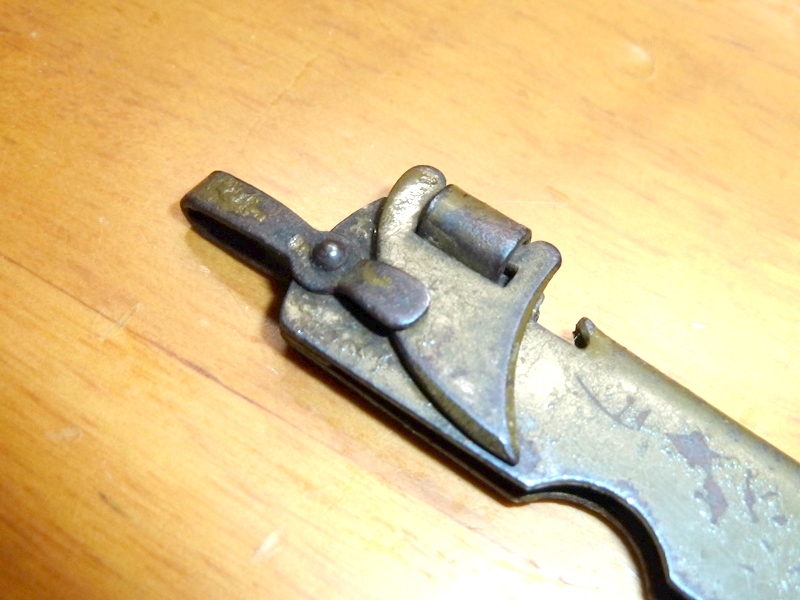 日本軍、陸軍 小刀 ナイフ 日本軍装備:装備 2015年05月09日 扱いが被服なのですがカテゴリは装備としました。 陸軍のナイフです。 日亜の刻印があります 言ってしまえば缶切り付きの普通の小刀ですが、 肥後守のように抑えが無いので若干使いづらい感じがします。 缶切りは押さえを外して90度開けます 実際に使うとすればこんな感じです。 (缶切り部分の塗装が直ぐに剥げてしまうので使うのはおすすめしません) また、栓抜きとしては使えませんでした ↑実際に試したところの切り口 この形式のナイフは、大きいのと小さいのの二種類あるのですが、 小型の方、今回のヤツは小さすぎて使い勝手は色々とギリギリな感じです。 ナイフの方も頼りない感じですし、缶切りもストロークが短い分開けるのに手間取ります。 ただ缶切り押さえ部を除いた長さが人差し指ぐらいしかなく、かなりコンパクトですから 携帯性は抜群です。 (当然今のご時世では無理ですが)