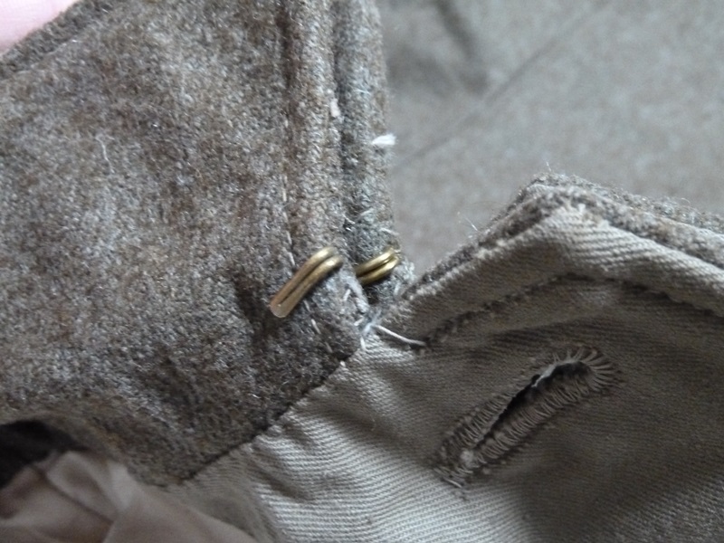 九八式軍衣 と 三式軍衣 との違い 日本軍装備:被服 2015年02月04日 左 九八式 右 三式 です。 どちらもほぼ同じサイズの 3号、中号です。 (2枚目の写真では反対になってます) 先ずタイトル通りに九八式軍衣と三式軍衣の違いを上げますと 現物を見て比べる限り(資料を参照したわけではないので断言してしまうと問題ですが・・・) 三式軍衣は九八式に比べて ・剣留めの短縮 ・ポケットの作りの簡素化 が有ると言えます 他にも閂(ボタンホールの端を縫い止めるやつ)が省略されたり 絨(生地)が混紡になったりと簡素化もあります。 ただ閂止と生地は、前者については昭和16年製の軍衣でも省かれた物があったり 逆に19年製のものに施されていたりと一貫していない感じがします。 生地についても正直よくわかりません。 すみません またネットで調べていた頃によく、九八式と三式は襟の大きさが違うという話を見ましたが 私が持っている軍服の中では(昭和13年から19年の夏冬衣両方共) 双方に違いは有りませんでした。 よくわかりませんが例外もあるということでしょうか・・・ まず一番目にあげた、剣留めの短縮については写真のように差があります。 (左 三式、右 九八式) 三式では長さに余裕が無くなっているので剣差しを取り付ける時に若干手間取ります。 上が三式、下が九八式です。 三式ではポケット端に末端の生地がはみ出ています 三式では脇裂の終端の補強が省略されています 強度が低下しますが大量生産のために犠牲にされた部分です。