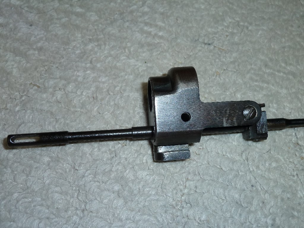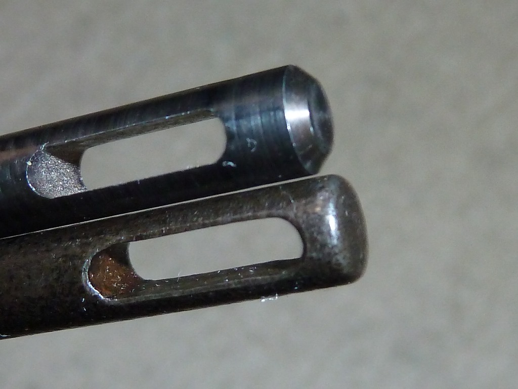 実物九九式短小銃 槊杖 (クリーニングロッド ) 、槊杖受(ロッドキャッチ) KTW_九九式短小銃 2014年07月03日 KTW九九式短小銃の実物部品交換に伴って槊杖も交換する必要が出てきたので落札しました。 実物のクリーニングロッドです 今回は長くなりそうなので3つのセンテンスに分けました。 実物の紹介 槊杖の長さは60.5cmです 複製品は何故か63cmらしいので、見分けるポイントになります。 また、実物はろう付けでなく一体成型です。 洗管をとりつけるための雌ネジです。 後端部分にあります。 (*取付イメージ) 先端はこうなっています。この実物では露出している部分とストックに収まっている部分とで 保存の状態が異なります。 収納される部分は極々美品なのですが先端部分は表面が傷んでしまっています。 叉銃するときにも擦れる部分ですし、ある程度の劣化は仕方ないとは思いますが、もっと状態が良い物が欲しいところです。 先端のアップ 錆びて傷んだ部分を塗装で誤魔化しているように思えます。 くぼみの部分にロッドキャッチが入り込んで固定されます。 この部分の形状が三八式歩兵銃用のさく杖とは異なりますので、相互の流用はできません。 また先ほども書きましたが、一体成型であって、ろう付けではありません。 刻印はありませんが、部品取りになったであろう元の無可動銃がマッチングしたものでであれば、製造所は鳥居松の物になります。 クリーニングロッドの構造について ストックに隠れる部分ですが、構造はこうなっています。 この先から40cm以上の棒が伸びています。 ですからつまり、先端の2点のみで保持しているということです 動かそうとした場合回転はしますが、ボタンを開放せずに引きぬくことは出来ません 丈夫にできていると思います。 槊杖受けのアップ 下部分がストックから露出しているのでそこを抑えながら槊杖を引き抜きます。 またこの部品はストックに囲まれ尚且つ銃剣止とも固定されているので 合理的に全体の強度確保に貢献しています。 KTW製だけ見ていた時はエンドキャップはただの飾りだと思っていたのですが、ちゃんと意味があったようです。この部品があるので長いクリーニングロッドでもガタつくことはありません。 先ほど槊杖は二点で保持されていると書きましたが、つまりこういうことです。 ただ、これらの部品は全て同じ無可動銃から取り外した物だから出来たわけで、 別々の銃から部品を取り出してこのようなことが出来るかどうかはわかりません。 少しでも位置がズレた場合は取り付けさえ困難になることが予想されます。 また、聞くところによるとタナカ製はクリーニングロッドがエンドキャップを抑えているという間逆な事になっているようです KTW製との比較 上はKTW製、下は実物です。 実物よりむしろKTW製のほうが綺麗です KTW製の物は旋盤目があります。シャープな出来栄えで格好いいです。 実物も旋盤加工のはずですが、細い部分を手作業で削ったのでしょうか柔らかい感じです。 ただ、あまりにシャープ過ぎて他の部品よりも浮いている感じは否めませんので、 実物と交換するのであれば、 クリーニングロッドのみを入手してグラインダーで切断&短縮 という荒業もアリかと思います。