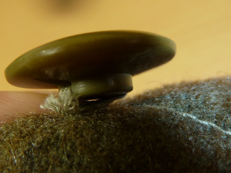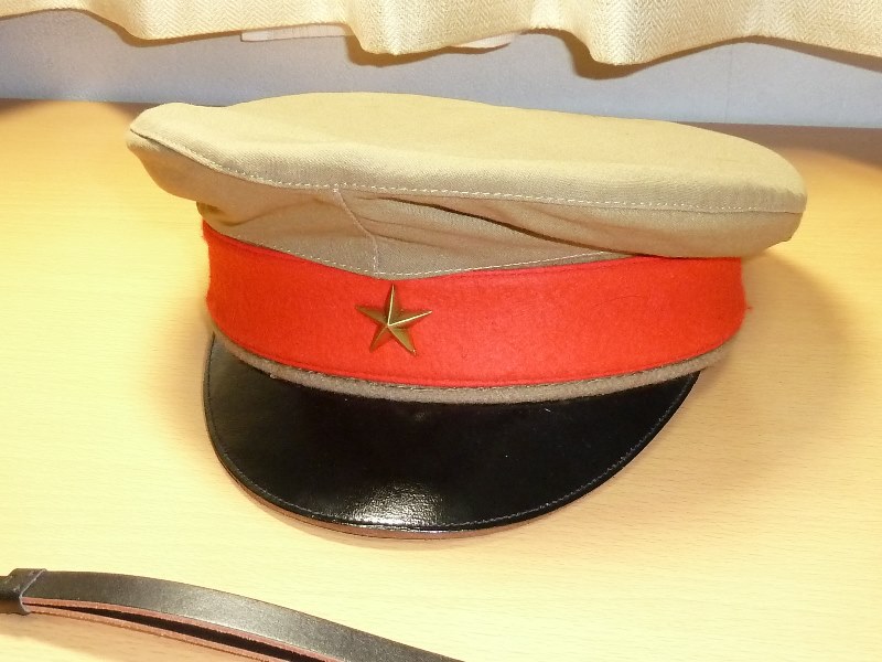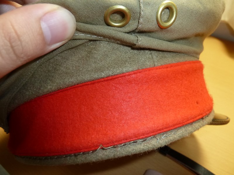 ふきや商店製 兵下士官 四五式軍帽&軍帽日覆 日本軍装備:被服 2014年08月17日 30年ぐらい前に作られたものらしいです 複製品のカバーを装着した状態です。 実物生地? 昭五式でしょうか 裏地も再現しているようで再現度は高いですが、ただひとつ頭頂部の形状が残念です。