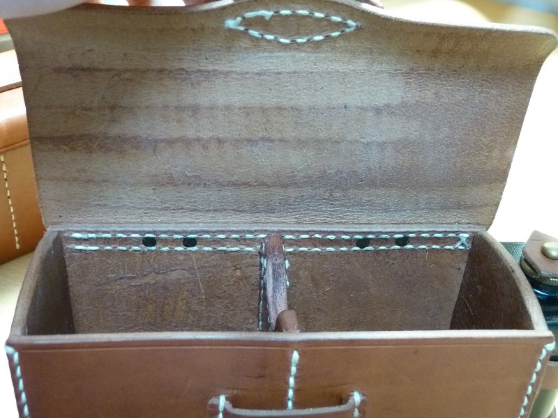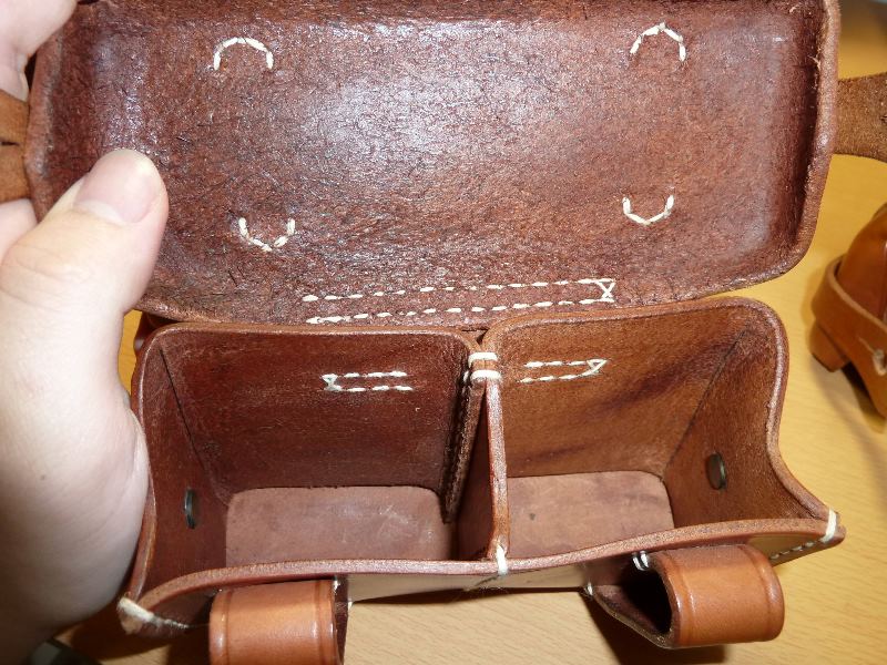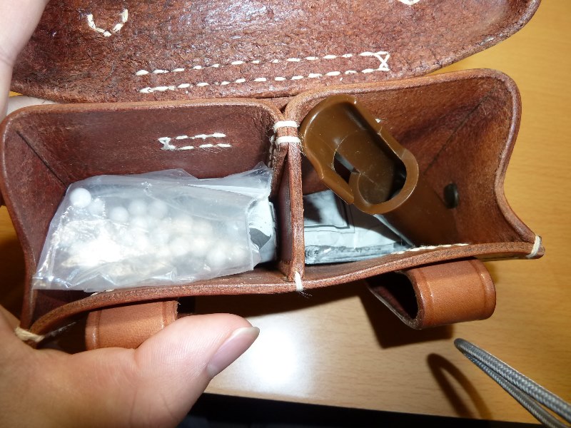 海外複製 九九式弾薬盒 その他 日本軍装備:装備 2014年05月21日 中田商店の商品は品切ればかりなので欲しいと思った時に買うことが出来ませんでした。 今回は安定的に供給されている中国製の弾薬盒を購入してみました。 俗にいう九九式弾薬盒は、革の節約などをしたものであるとされています。 確かに三八式のそれと比較してサイズも小さく正面の革が側面に回りこむなど生産性(?)の配慮もされているようです。 その構造がまさに欠点で、このように革が折れ曲がり開閉が困難になります。 実物はしっかりと出来ていてこのような事は無いのですが、中国製では配慮が欠点として現れているようです。 また余談ですが、実物の場合、革を3枚重ねにして強度を確保しているものもあります。 かなり豪華仕様ですが、昭和16年製でした。 仕方がないので折れ曲がっている部分は新聞紙で埋めることにしました。 片方は床面が毛羽立っているようだったのでトコノールで固めました。 この部分も気になりますね。 サバゲー時にはこのように扱っています。 予備弾や銃口蓋は軍服のポケットに入れたほうが便利なのですが そこは形を重視した上で敢えてこのようにしています。 走った時に中身が蓋にあたって音が出るので新聞紙で嵩上げしています。 こちら後盒です 仕切りも革3枚重ねだったり、釦も加工されていたりと豪華(?)仕様です。 しっかりとした形なので開閉に苦労はありません。 前盒とは対照的です。 ただしあくまで九九式弾薬盒の話です。 油缶が付属していて、蓋をあけるとこのような感じになっています。 使うことはないと思いますが、布を巻いてやることも出来そうです。 収納時は写真のようにしまうのですが、これがどうもキツキツでうまくいきません 最後に帯革です。 最もベースとなる部分であって一番大事です。 バックルの形状・縫い付け方法共にマトモな部類だと思います。 特に不都合はありません。 床面は磨きこまれているのですが、これが逆に悪い方向に向いています。 ツルツルなので走った時に服の上を滑ります。 弾薬盒が動くので鬱陶しい上に疲れます。 どうにかならないかと画策していますが、中田商店製にしたところで中国製なのでこの点は変わらないように思えます。