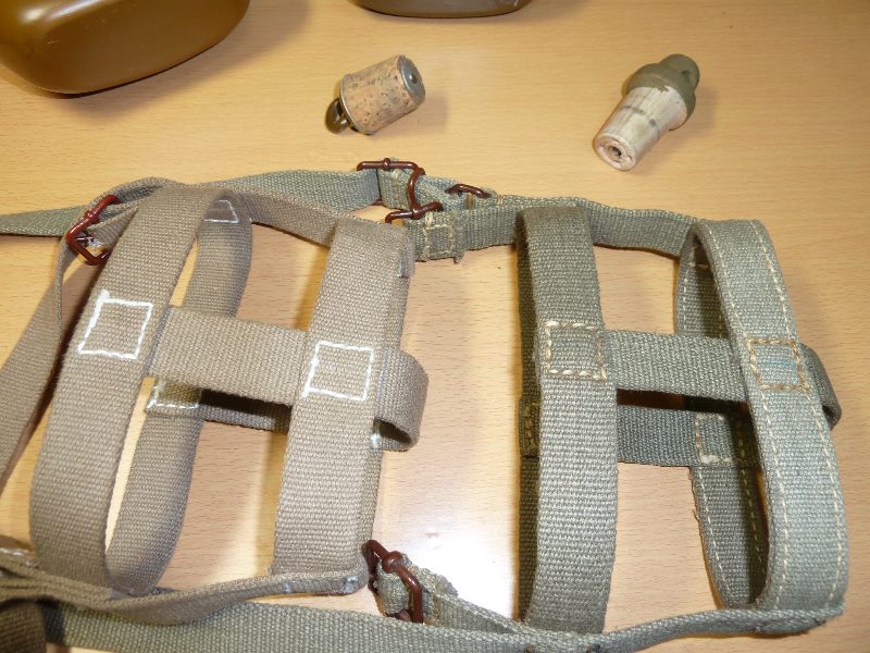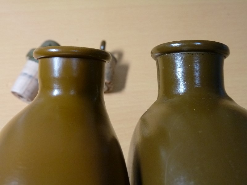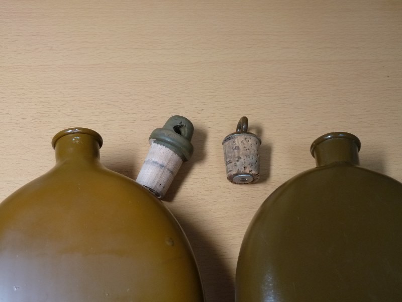 実物 &複製品 日本軍 伊号昭5式水筒 比較 日本軍装備:装備 2014年09月10日 特に実物に興味があったわけではないのですが、複製品の水筒の再塗装をするにあたって実物を参考にしたくなったので入手してみました。 左海外製複製品 右が実物です。 パッと見良く出来ています。 実物を型取りして複製したのでしょうか。 勿論実物にもいろいろあったはずですが、これらの違いに関して言いますと、 肩紐の色、水筒本体の厚みが違うようです。 水筒は木製とコルク製で異なります。 栓にカビが生えていないのが奇跡的です。 こんなかんじです。 素材はアルミのようですが白錆すらありません 左複製品 重箱の隅をつつくようですが、注ぎ口の形状が実物とは若干異なります 実物と複製品の内部の違いです。複製品は溶接ですが、実物は鋳造のようです。 実物の方は腐食どころか錆さえもなく完全に新品の状態です。 奇跡的な状態で、贋作ではないかとさえ思えてきます。 実物の方は完全に新品状態なので使用するにもあまり抵抗がない感じです。 対して複製品は凸凹があったり、黒ずんでいたりと正直言って実用する気にはなりません 重金属が溶け出してきそうで、煮沸とかそれ以前の話な感じがします。 とはいえ実物の方も流石に70年以上前のものですから水を入れて飲むなんてことはしませんけどね・・・ ゲーム中の水分補給は別の方法を考えることにします。 刻印 日本アルミとあります。 肩紐ですが、これもかなり良く再現されています。 紐がペラいのと、後述する事以外は完璧だと思っています。 金具部分もかなり巧い感じです。 縫い目の位置が少し下めですが気になる程では有りません。 複製品は実物よりも肩紐を延長しているという話でしたが・・・ 実物のほうが7センチほど長いようでした。 某所では延長品のみを販売しているようなので、中国製と混同してしまったようです。