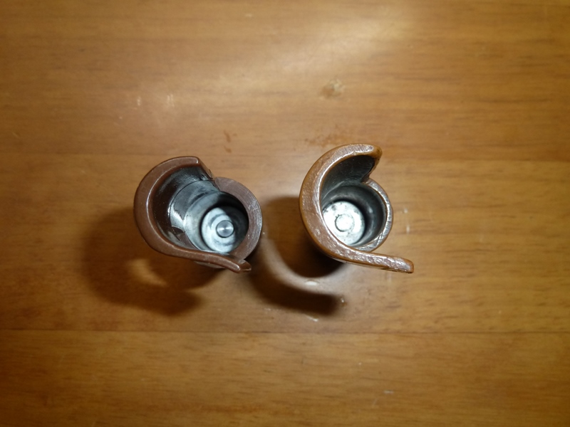 九九式短小銃 銃口蓋(マズルカバー) 樹脂製の実物と複製品 日本軍装備:装備 2015年02月09日 撮影している時に配慮が欠けていて、実物と複製品の位置がごちゃごちゃになっています すみません 薄い色のほうが実物です 複製品は実物から型を取ったのか、よく再現されています。 細かいことを言い出せば、ベークライトとプラスチックという材質の違いで手にとった時の重さや 角の形が違ってきていますがエアガンに付けるだけなら複製品でも十分だと思います