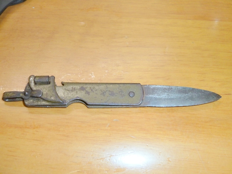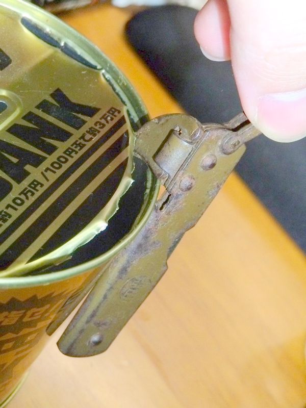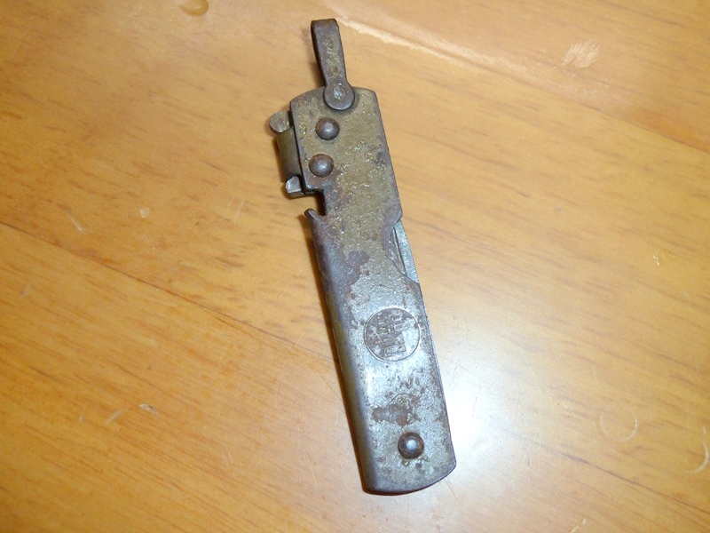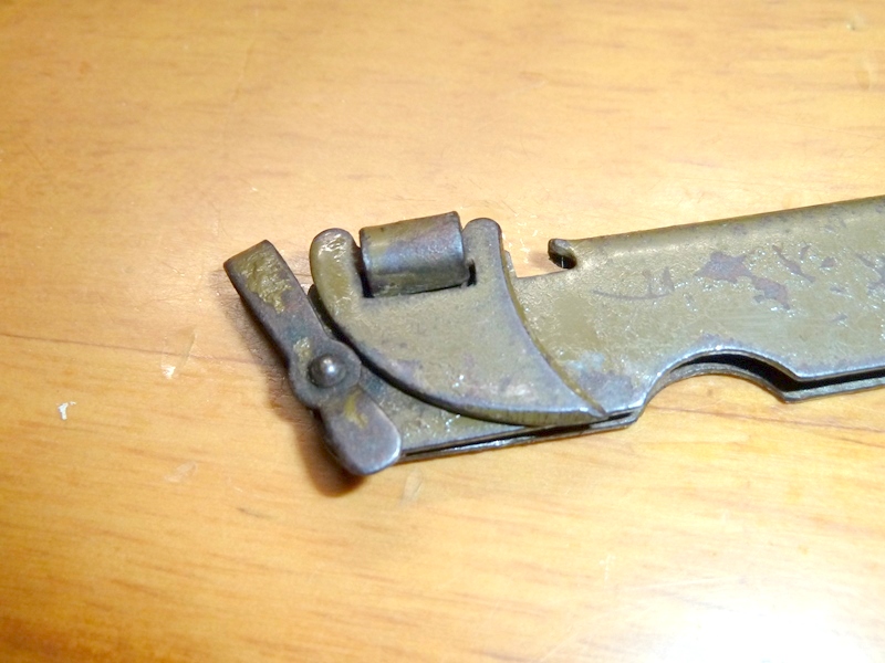 日本軍、陸軍 小刀 ナイフ 日本軍装備:装備 2015年05月09日 扱いが被服なのですがカテゴリは装備としました。 陸軍のナイフです。 日亜の刻印があります 言ってしまえば缶切り付きの普通の小刀ですが、 肥後守のように抑えが無いので若干使いづらい感じがします。 缶切りは押さえを外して90度開けます 実際に使うとすればこんな感じです。 (缶切り部分の塗装が直ぐに剥げてしまうので使うのはおすすめしません) また、栓抜きとしては使えませんでした ↑実際に試したところの切り口 この形式のナイフは、大きいのと小さいのの二種類あるのですが、 小型の方、今回のヤツは小さすぎて使い勝手は色々とギリギリな感じです。 ナイフの方も頼りない感じですし、缶切りもストロークが短い分開けるのに手間取ります。 ただ缶切り押さえ部を除いた長さが人差し指ぐらいしかなく、かなりコンパクトですから 携帯性は抜群です。 (当然今のご時世では無理ですが)